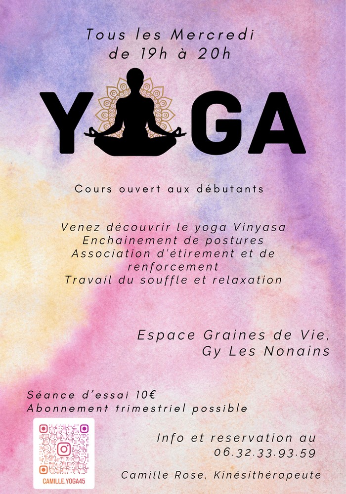 Venez découvrir le yoga Vinyasa, enchainement de postures, association d'étirement et de renforcement, travail du souffle et relaxation à l'espace graines de vie